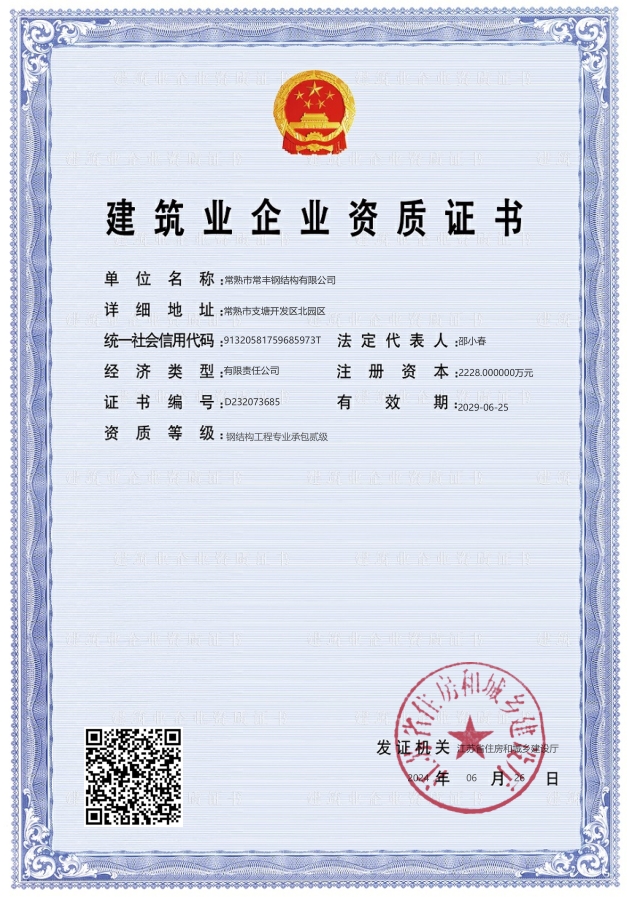 常熟市常豐鋼結構有限公司,位于風景秀麗的常熟市支塘鎮(204國道旁)毗領蘇嘉杭高速公路,水陸交通十分便利。 本公司成立于2001年,是承接重鋼、輕鋼,景觀鋼構,鋼管桁條,網架、彩鋼板專業制作、安裝一體的企業,并取得國家建設部頒發的鋼結構專業承包安裝二級資質,是蘇州地區具有較高的知名度和較高競爭企業。 公司擁有工程師8人,技術人員26人,職工150多人。并擁有一支專業的鋼結構安裝隊伍。公司總占地面積25000m2,鋼結構公司占地面積11000m2。公司擁有先進的H型鋼生產設備,擁有數控多頭直線切割機,阻力機,自動埋弧焊機,矯正機,拋丸除銹機等設備,并配備有輕鋼結構輔助生產設備,電腦數控C型鋼成型機,各規格彩鋼壓型瓦生產設備及彩鋼夾芯板流水線設備。公司嚴格把關質量100%的為客戶提供優質產品。 多年來,我公司依靠自身的設計、織造能力,已為數百萬